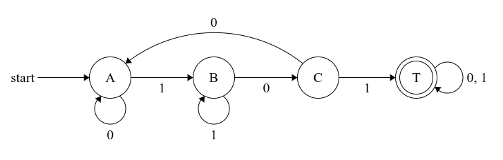 관찰해보면 $1010$을 DFA에 넣으면 $ A \rightarrow B \rightarrow C \rightarrow T \rightarrow T$ 를 거쳐서 AC한다.
