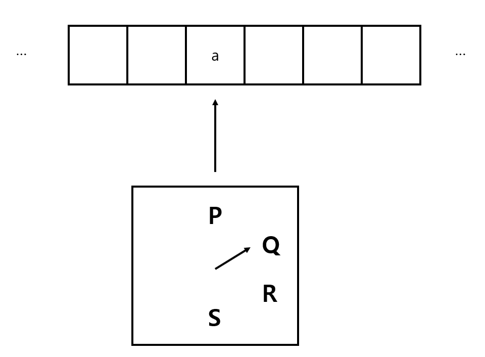 밑에 있는 P, Q, R, S는 각각 state를 의미하고 현재 Q를 가리키는 화살표가 Finite Control이다.