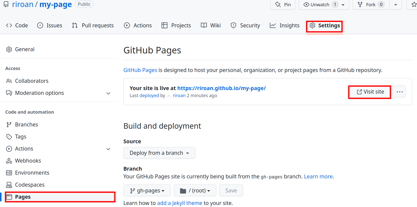 Settings -> Pages로 가보자.