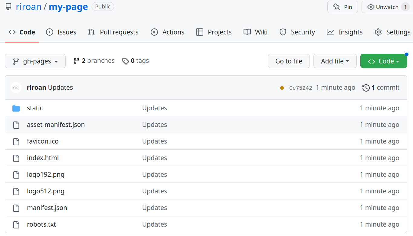 작업이 완료됐다면 깃허브 repository에 자동으로 gh-pages라는 브랜치가 생기고 빌드된 파일들이 저장돼있다.