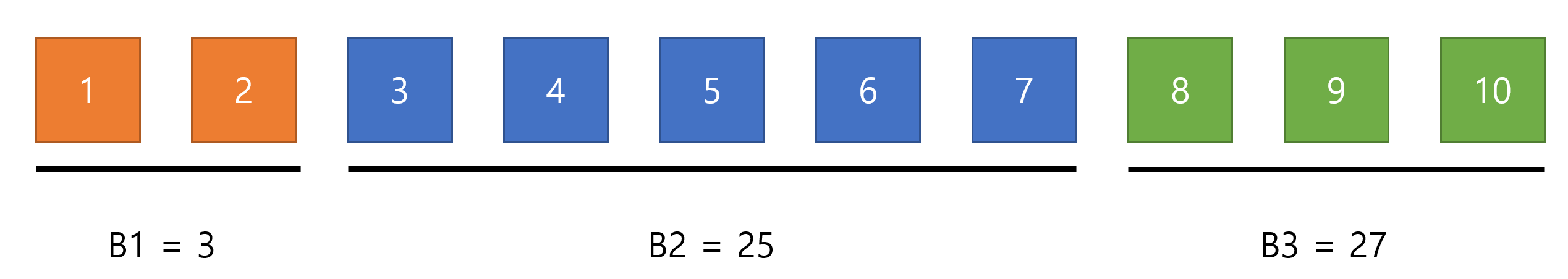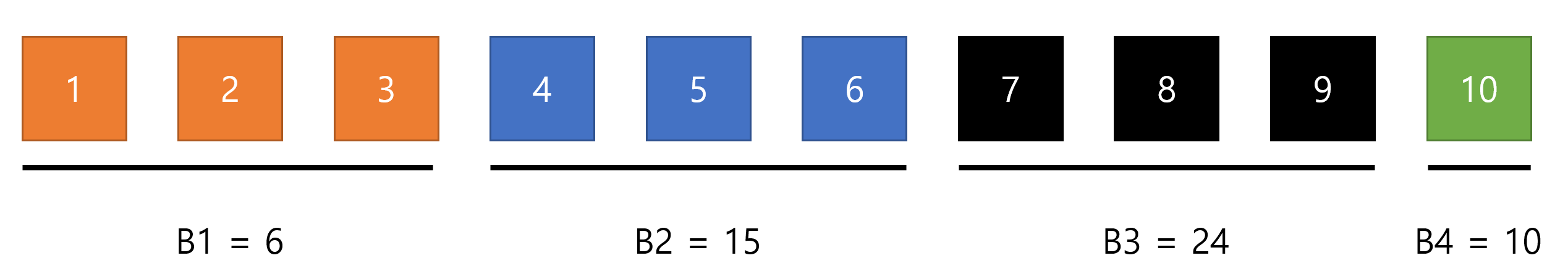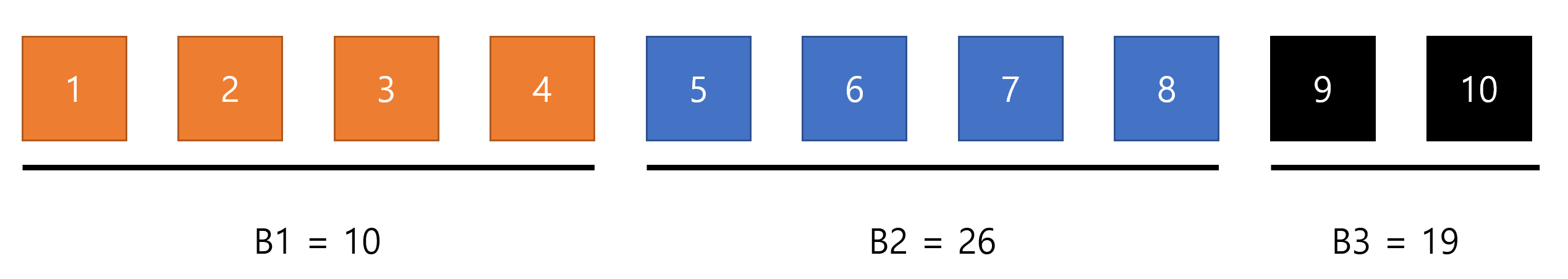 같은 색은 같은 버킷에 있다는 뜻이고 같은 버킷에 있는 수들의 합은 B값으로 따로 관리해준다.