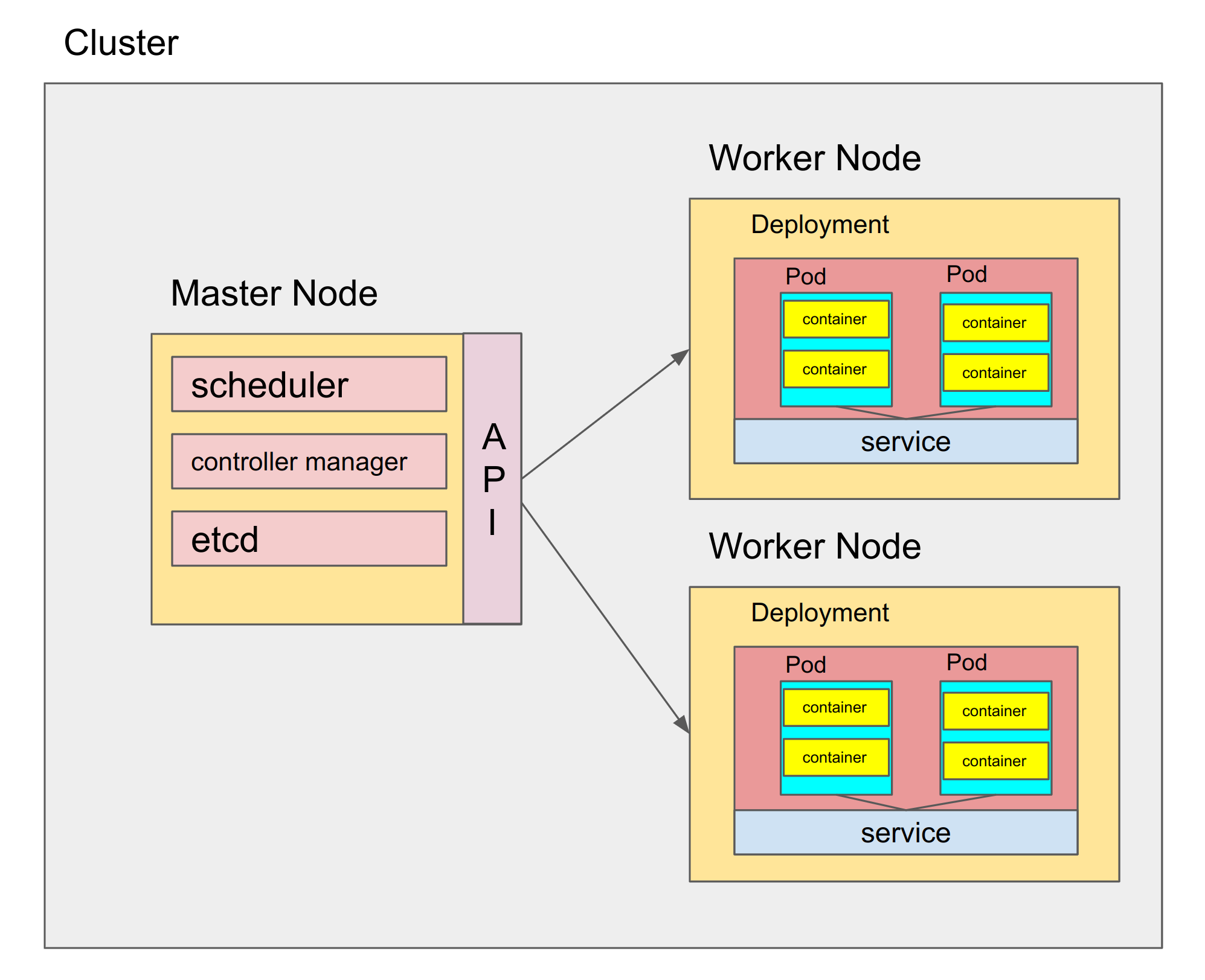 쿠버네티스 구성을 간략하게 나타내면 위 그림과 같이 나온다. 기본적으로 클러스터는 하나의 마스터노드와 여러개의 워커노드로 이루어져있다. 여기서 클러스터는 하나의 쿠버네티스를 나타내는 논리적 단위로 생각하면 된다. 노드는 PC, 컨테이너, 가상머신등 하나의 서버라고 생각하면 된다.