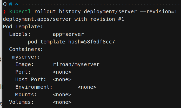 우리가 처음 만든 pod 정보이다. riroan/myserver 이미지를 사용한 것을 확인할 수 있다. 위에서 롤백하기 위해 undo를 사용했는데 to-revision을 사용하면 해당하는 revision으로 롤백이 가능하다.