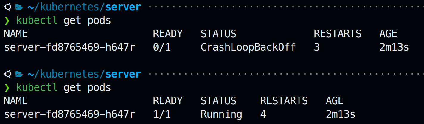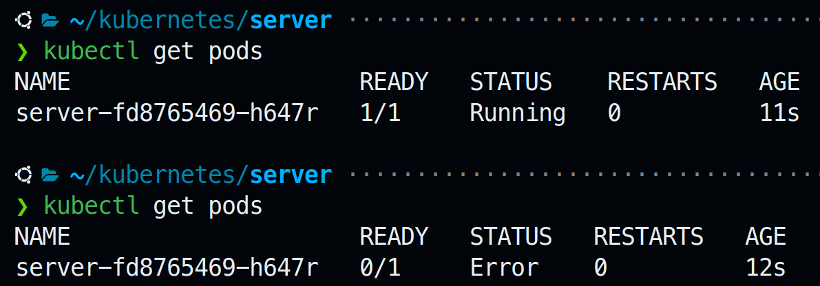 정상적으로 running하다가 assert때문에 Error가 난 것을 알 수 있다. 하지만 쿠버네티스는 이렇게 Error가 나면 자동으로 복구를 시도한다.
