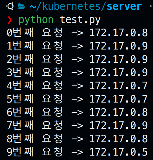 각 파드는 ip주소가 모두 다르다. Service가 정상적으로 Loadbalancing을 해준다면 접속할때마다 ip가 다르게 출력될 것이다. 실제로 그런지 확인해보자.