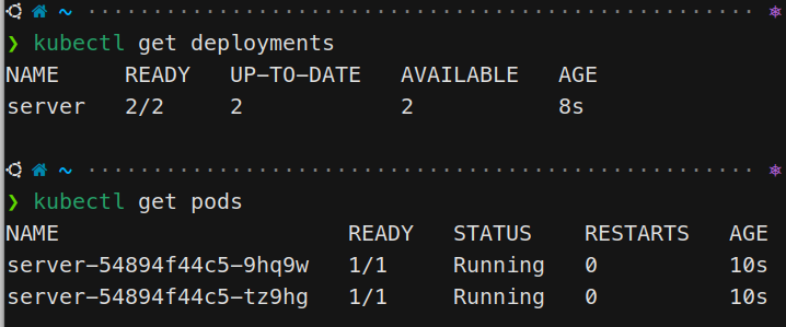메타데이터는 키-값쌍의 레이블을 지정할 수 있다. pod에 레이블을 지정하고 selector로 제어할 pod를 지정하였다. 이렇게 해서 현재 deployment는 app: server라는 레이블을 가진 pod를 제어한다고 알려준다.