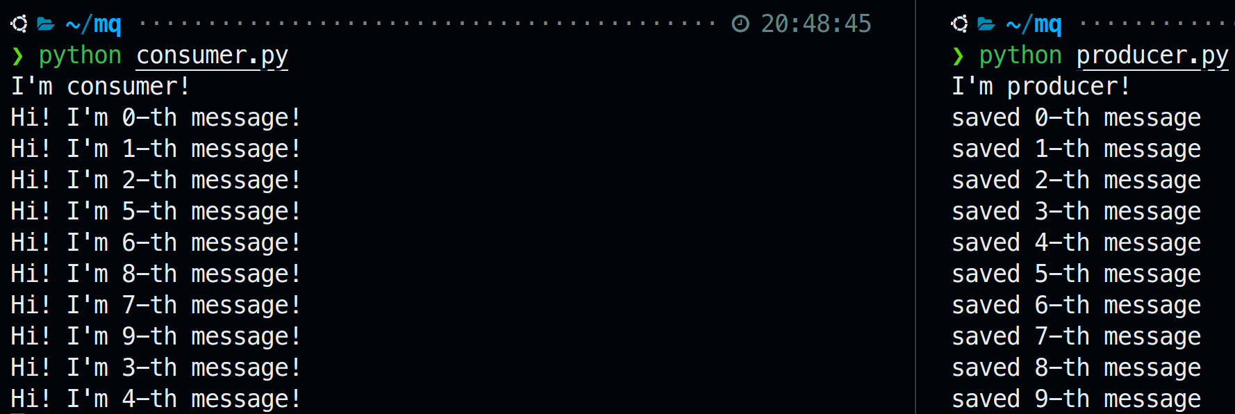 속도가 너무 빨라서 producer가 보낸 순서대로 consumer가 읽지 못했다. 순서가 필요없다면 이런 방법을 사용할 수 있을 것이다. 이러한 방식을 풀(pool) 방식이라고 한다. 풀 방식의 특징은 순서를 저장하지 않는다. 우리는 순서가 유지되길 원하므로 코드를 살짝 수정해보자.