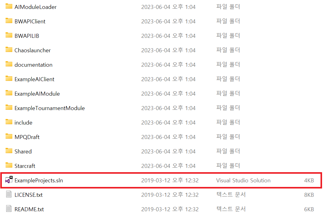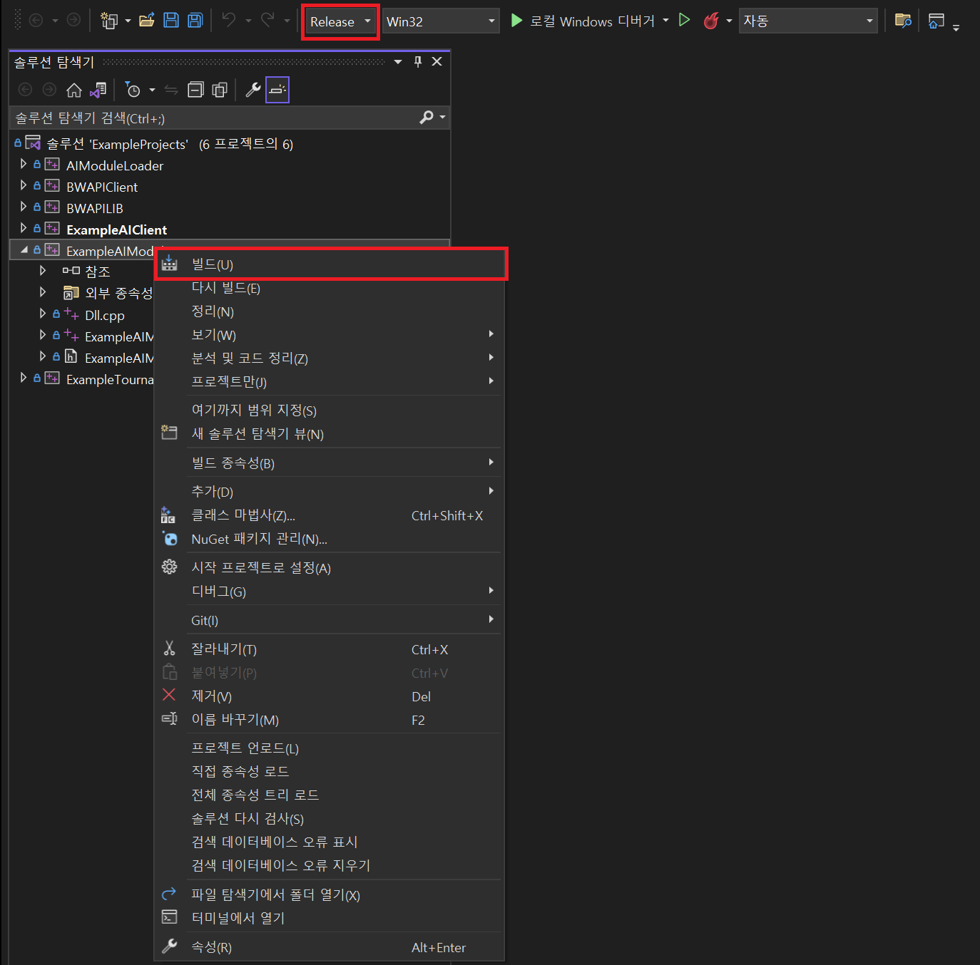 빌드 모드를 release로 변경하고 빌드를 실행한다. 성공하면 Release폴더에 ExampleAIModule.dll 파일이 생긴다. 이제 BWAPI/Starcraft폴더 안에 bwapi-data폴더를 스타크래프트가 설치된 폴더에 복사한다. 그 후 AI폴더를 만든 후 안에 ExampleAIModule.dll파일을 넣으면 된다. 스타크래프트의 폴더구조는 다음과 같이 된다.