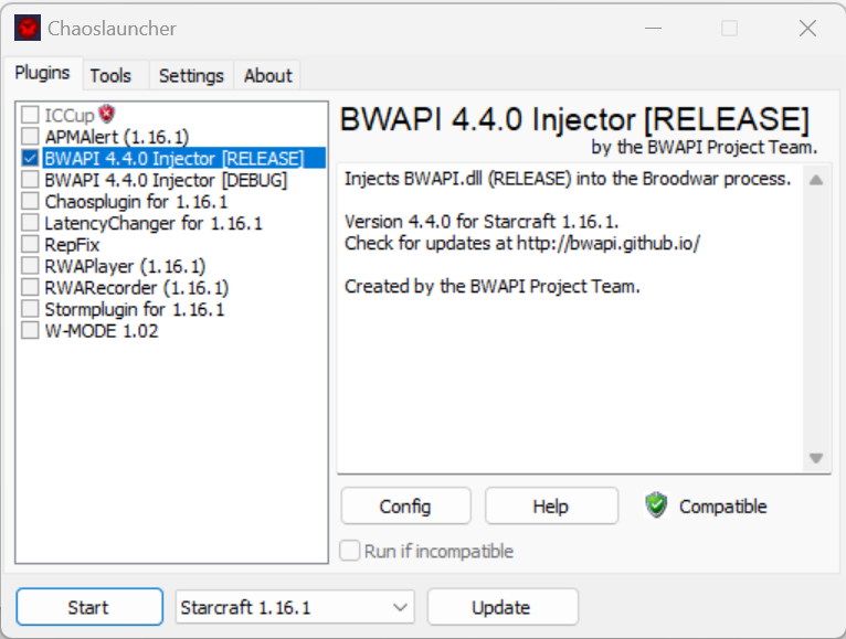 Settings에서 스타크래프트 폴더를 지정하고 BWAPI 4.4.0 Injector[RELEASE]를 선택한다.
