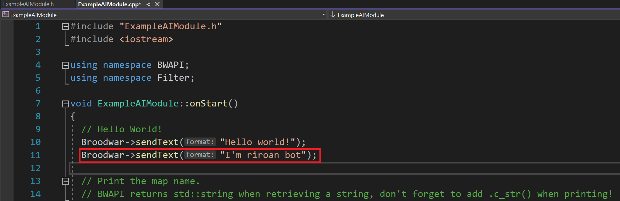 ExampleAIModule.cpp와 ExampleAIModule.h를 수정하여 개발하면 된다.