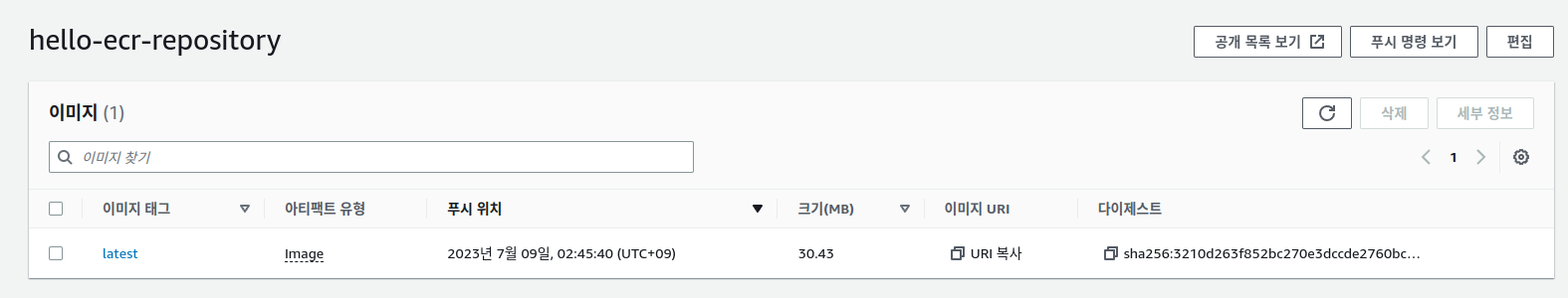 ECR_URL은 ECR에서 레포지토리를 만들 때 이름 입력하는 곳에 있던 URL이다. 레포지토리 목록으로 가면 있을 것이다. 뒤에 hello-ecr-repository는 위에서 만든 ECR 레포지토리 이름이다. 이상태로 빌드하고 푸시해보자.