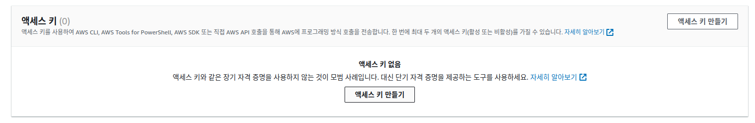 그 후 해당 사용자로 들어가서 보안 자격 증명에 있는 액세스 키 만들기를 통해 액세스 키와 시크릿 키를 생성한다. 사용 사례는 CLI로 선택한다. 생성된 키는 잘 보관한다.