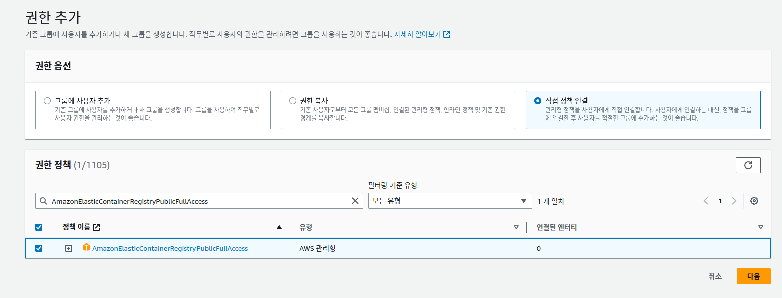 지금은 public을 사용할 것이니 AmazonElasticContainerRegistryPublicFullAccess를 선택한다.