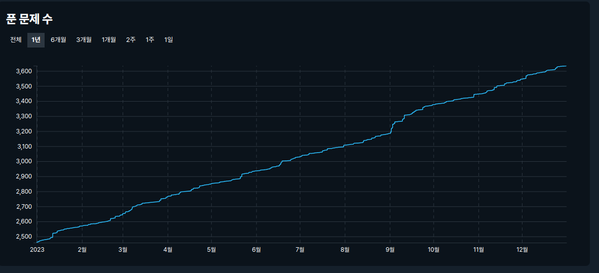 해결한 문제수가 1년내에 2464 -> 3635가 되었다. 하루에 스트릭 유지를 위해 적어도 한 문제를 풀기때문에 365문제는 기본이고 대회나 개인적인 공부, 추천받은 문제들을 해결하다보니 1000문제 이상 해결한 것 같다. 단기적인 목표는 문제 출제 자격인 4000문제 해결이다. 얼마 안걸릴것 같다!