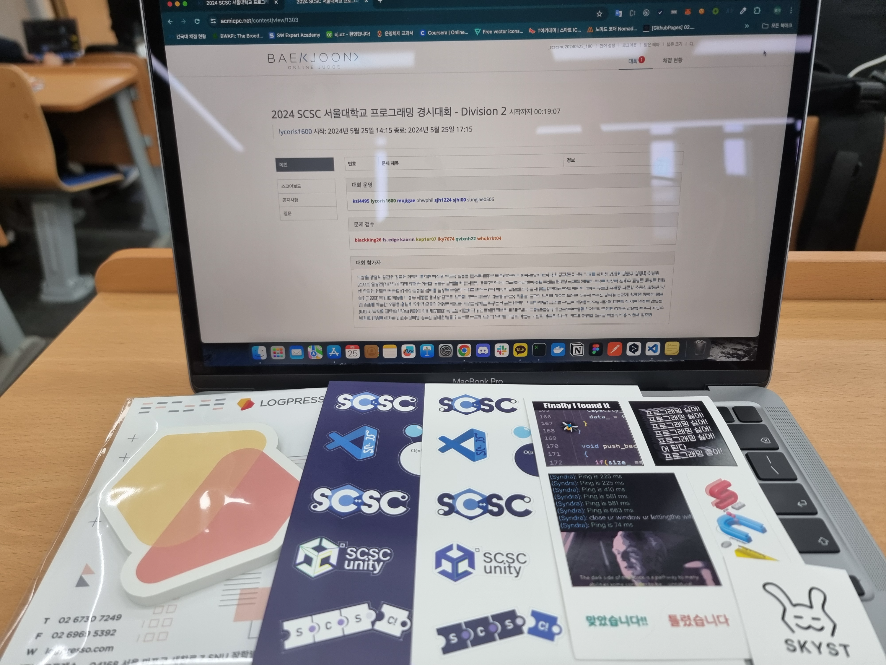 처음 신청할 때 생각없이 Div 1로 신청했는데 대회 3일 전쯤에 Div 1은 정말 어려우니 Div 2로 바꿀 수 있는 마지막 기회를 준다는 문자를 받았다. ㅋㅋ 이 문자를 받고 겁쟁이가 돼서 후다닥 Div 2로 바꿔서 참가했다. 그렇게 Div 2로 들어와서 보니 한 150명 정도 참가한 것 같다. 대회 시작 전에 운영진 분들이 기념 품과 계정을 나눠주는데 종이에 써 있는 것을 일일히 찾아서 나눠주다보니 시간이 지체됐다. (물론 정렬하고 이분탐색 하셨겠지?) 그래서 대회가 15분 미뤄졌다. 많이 고생하신 것 같다..