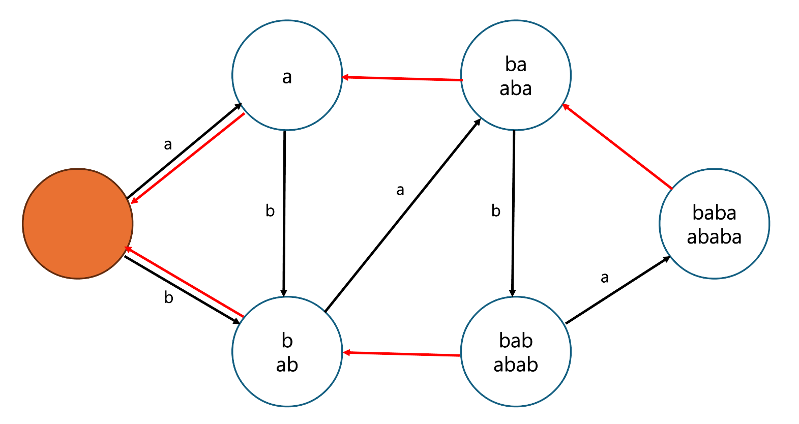 suffix link의 개념은 간단하다. 단순히 현재 상태의 $Endpos$를 부분집합으로 가지는 가장 작은 크기의 $Endpos$를 가지는 상태로 연결하는 간선이다. 상태 $v$의 suffix link를 $link(v)$라고 하면 $Endpos(v) \subset Endpos(link(v))$이다. 예를들어 $Endpos(ababa) = \{4\}$가 있을 때 $Endpos(a) = \{0, 2, 4\}, Endpos(ba) = \{2, 4\}$ 둘 다 부분집합으로 가질 수 있기때문에 가장 작은 $Endpos$상태인 $\{ba, aba\}$로 간선을 뻗어주면 된다.
