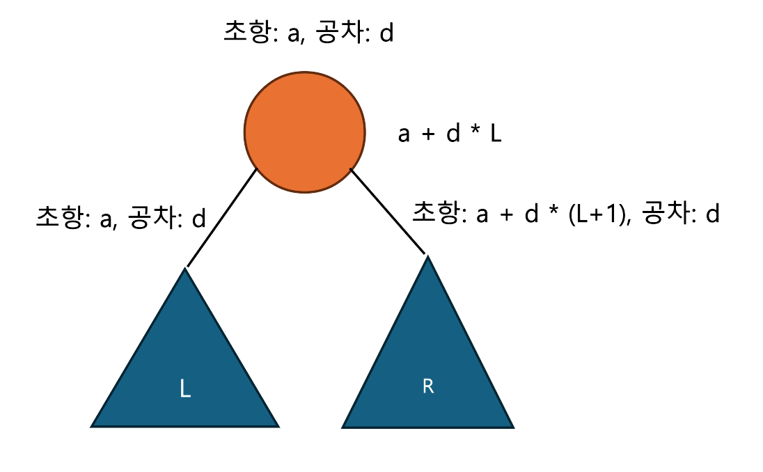 기본 lazy propagation은 구간에 같은 값을 더하거나 대입하지만 등차수열로 업데이트하라는 문제가 있다. lazy값을 push할 때 초항과 공차를 잘 push하면 된다. 초항이 $a$이고 공차가 $d$인 등차수열을 구간에 업데이트하려면 아래 그림과같이 하면 된다.