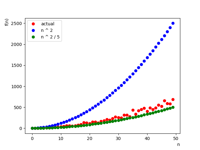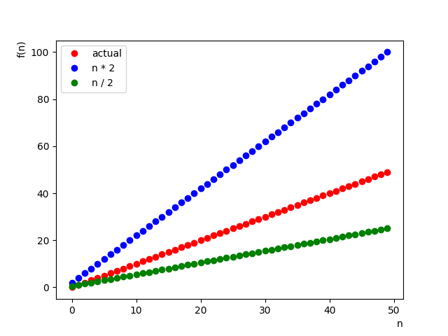 빨간색 그래프가 실제 결과 $f(n)$인데 각 점근적 표기법의 정의에 따르면 다음과 같다.