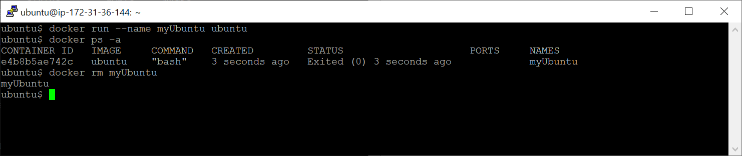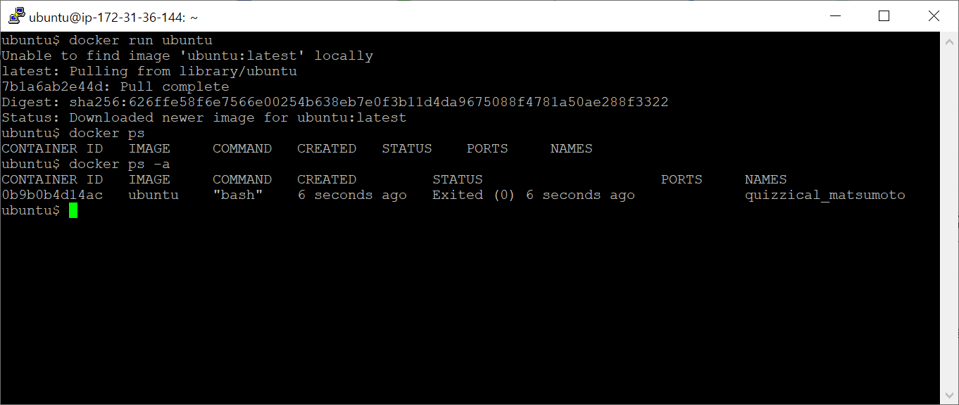 지난시간과 마찬가지로 우분투가 시작하자마자 끝났기때문에 docker ps 에는 나오지 않고 docker ps -a에 나오는 모습을 볼 수 있다.