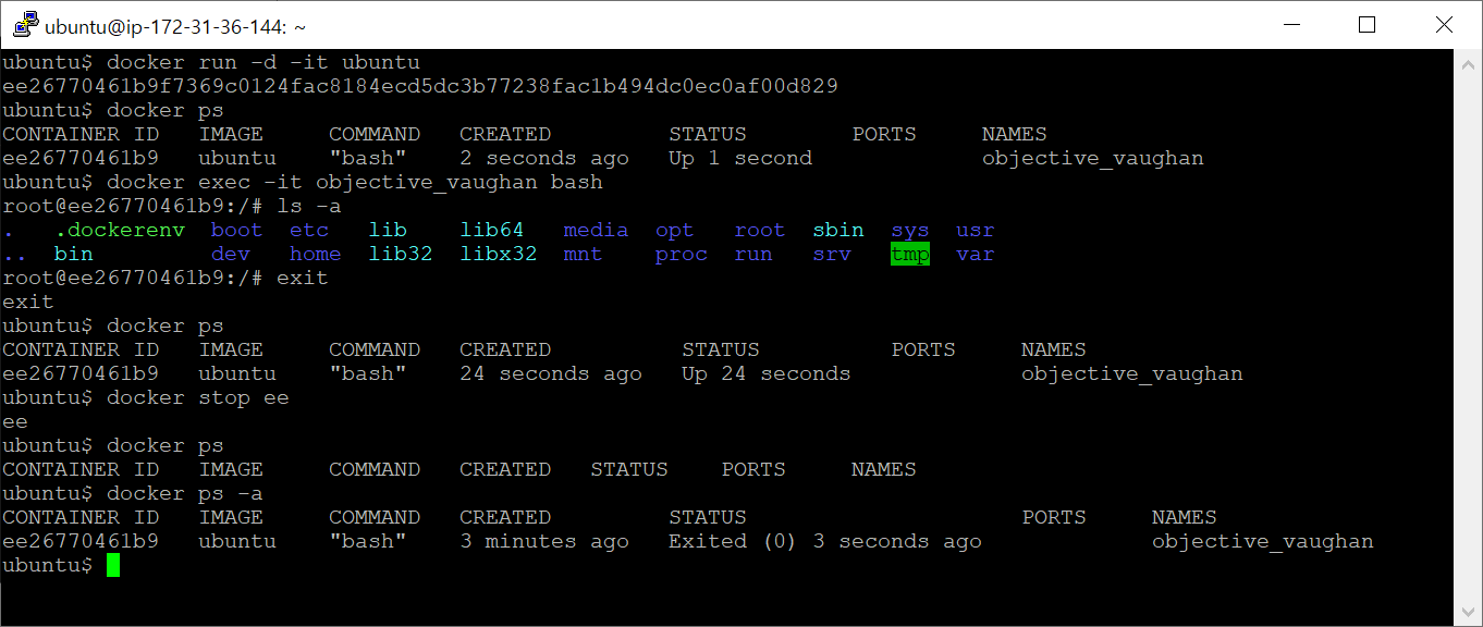 이 명령어를 입력해 컨테이너로 들어와 ls -a 명령어가 작동하는것을 확인한 후 exit으로 빠져나와도 docker ps를 확인해보면 아직 멈추지 않은것을 볼 수 있다.
