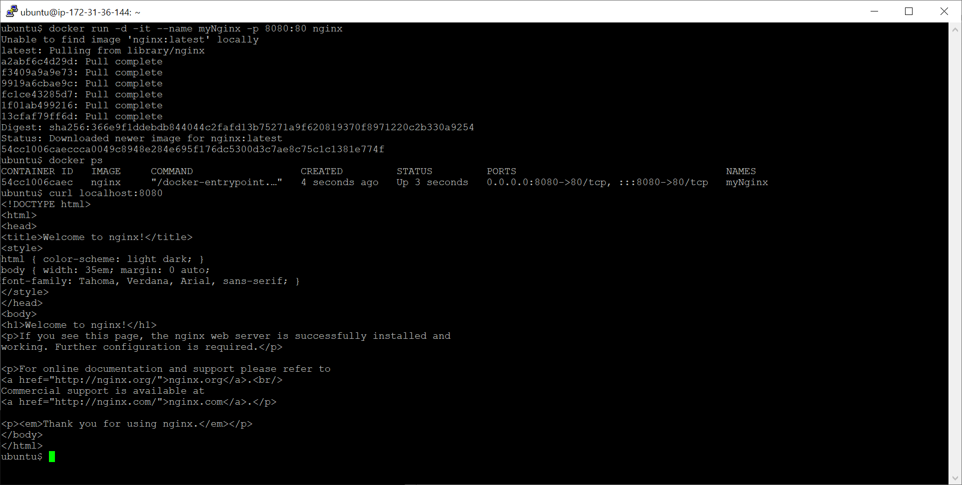 그 후 8080포트로 http 요청을 보내면 nginx응답이 정상적으로 오는 것을 확인할 수 있다.