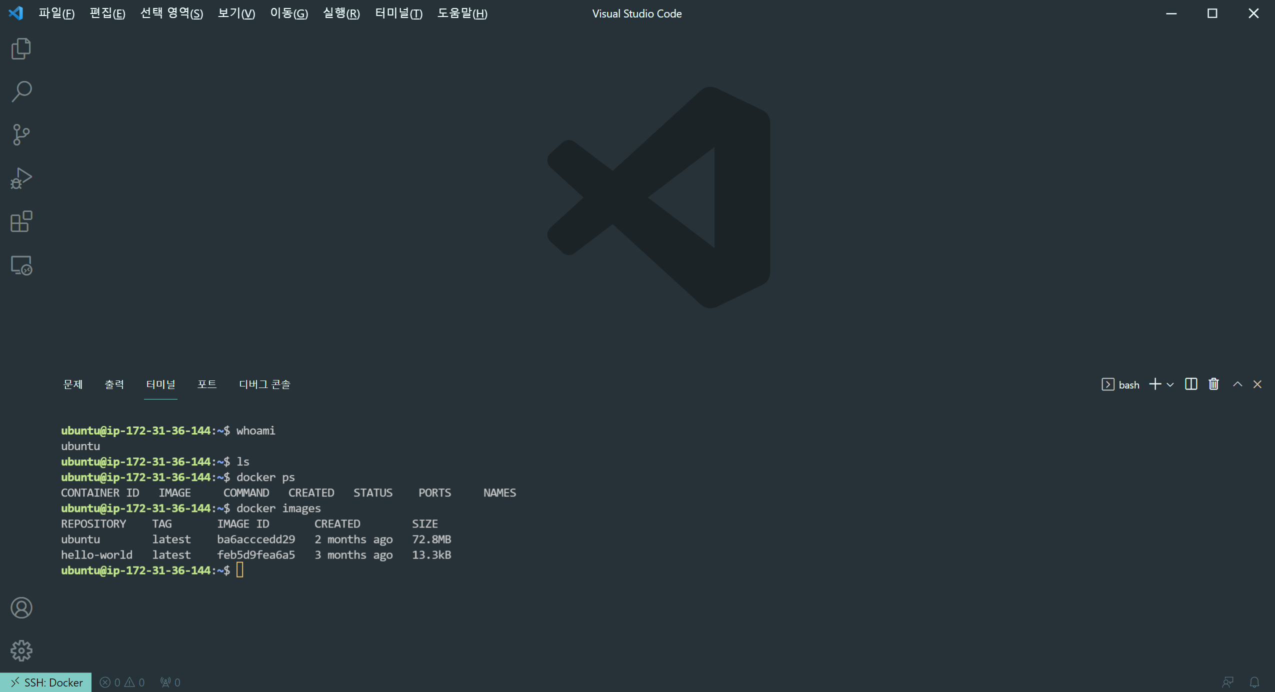 좌측 하단에 SSH표시가 나오고 터미널도 우분투터미널로 바꼈다.