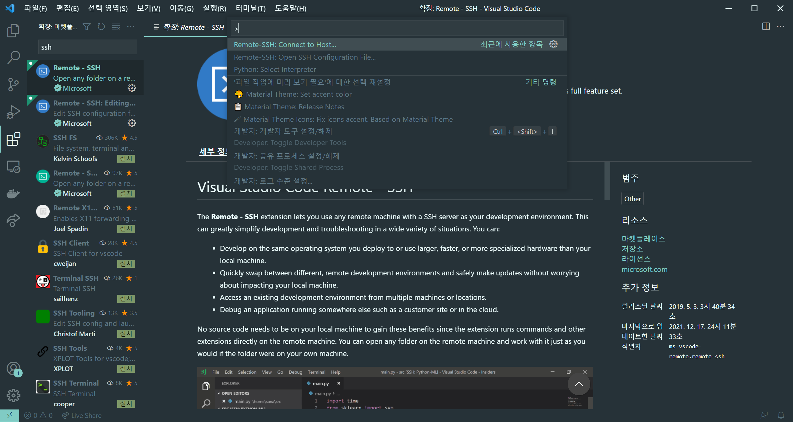 입력이 완료되었다면 저장하고 다시 Ctrl + Shift + P를 눌러 Connect to Host 를 클릭해 접속하려는 Host를 클릭하면 ssh접속이 시작된다.