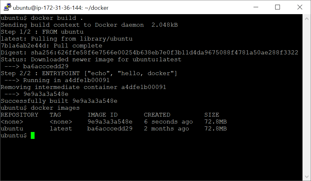 이미지가 두개 생겼는데 하나는 FROM에 사용된 ubuntu이미지, 다른 하나는 우리가 만든 이미지인데 이름을 명시하지 않아서 <none>이미지가 하나 생겼다.