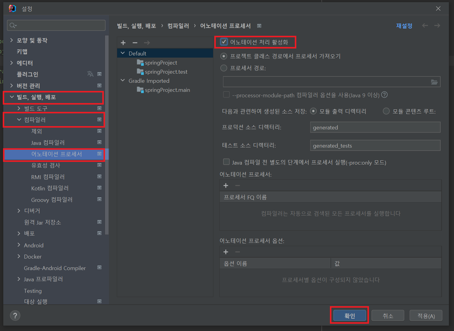 롬복은 어노테이션을 사용하기 때문에 어노테이션설정을 해줘야 한다.