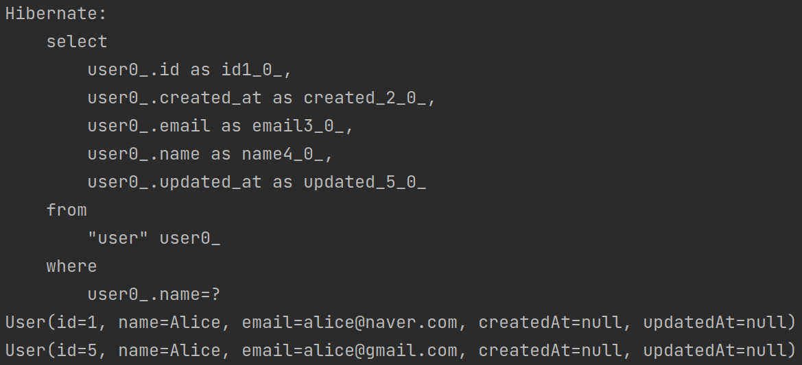 List<User> users = userRepository.findByName("Alice");