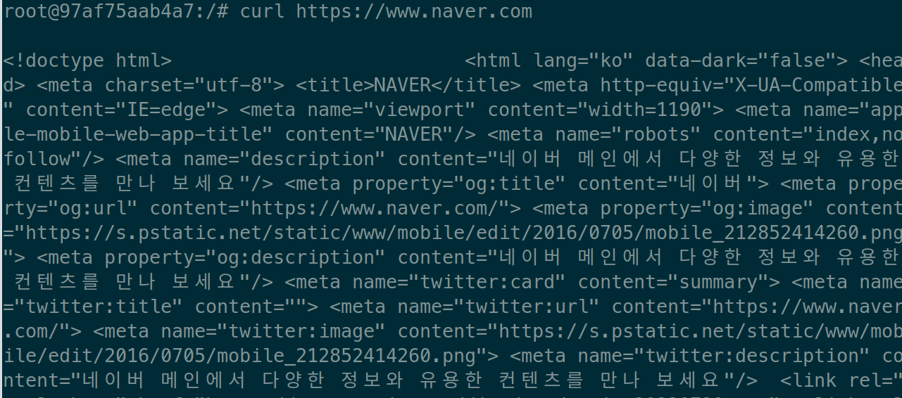 이제 ubuntu컨테이너에 curl을 다시 깔고 통신을 하는데 통신 대상을 대상 컨테이너 이름으로 한다.