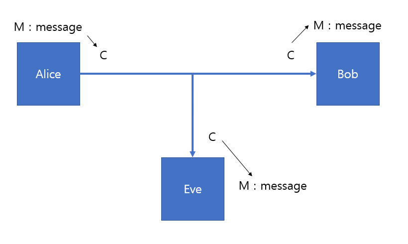 그 과정중 Eve라는 어떤 사람이 암호문 C를 가로챌 수 있다. (위/변조는 지금 생각하지 말자.)